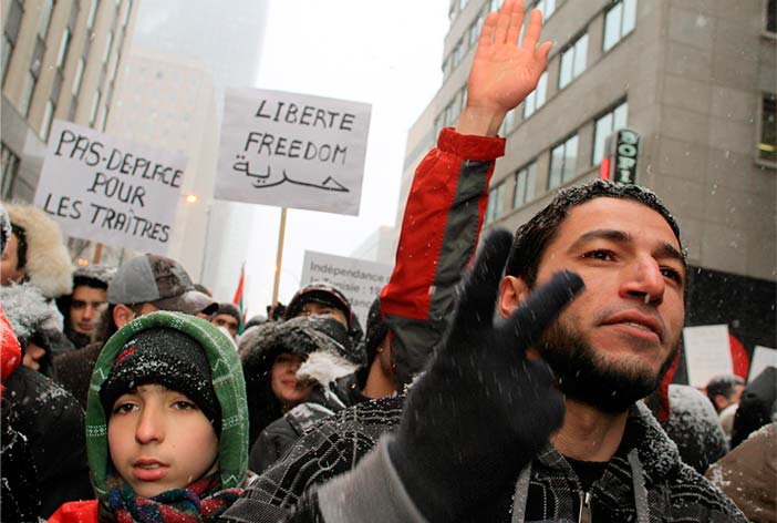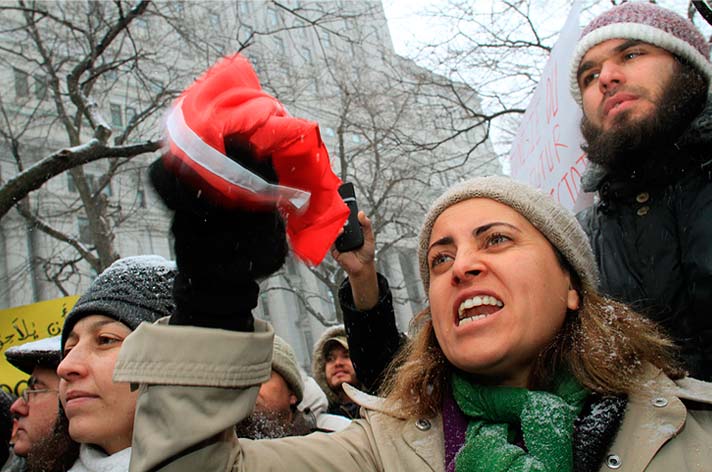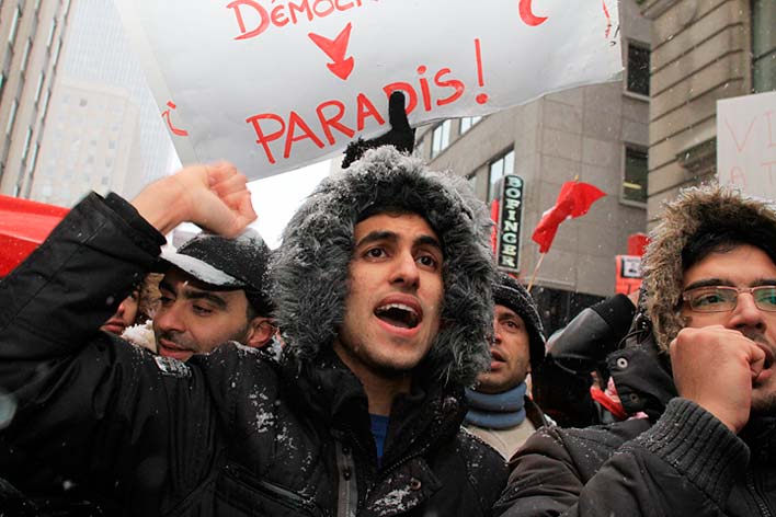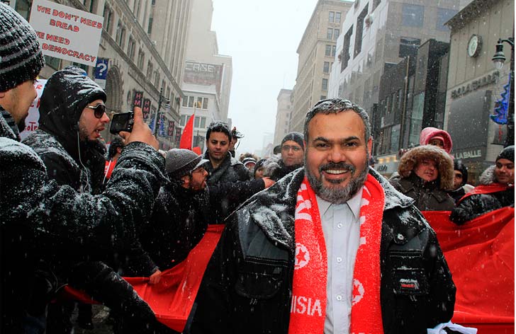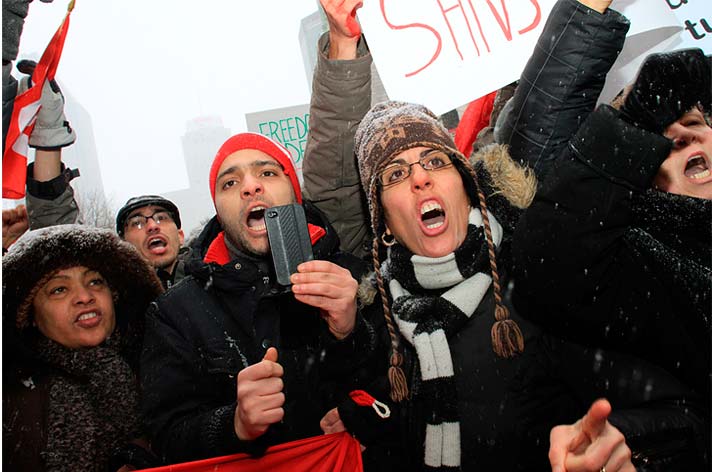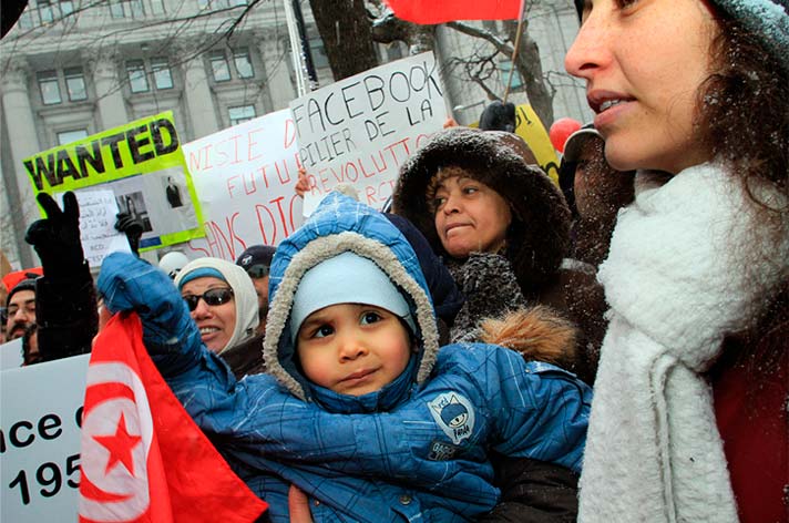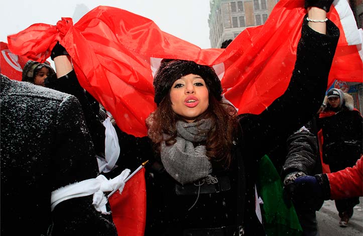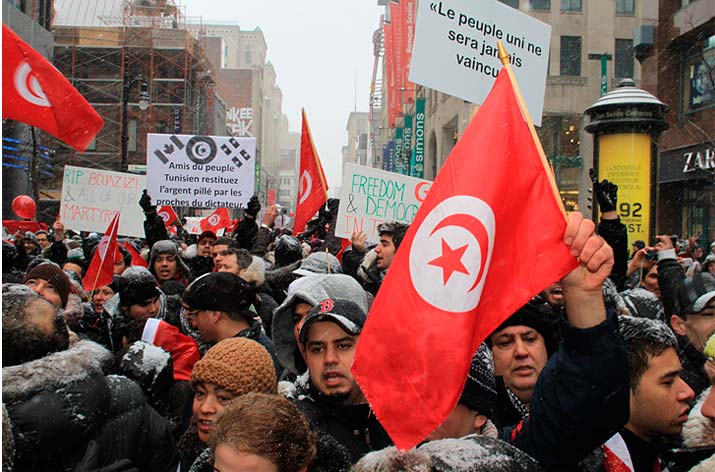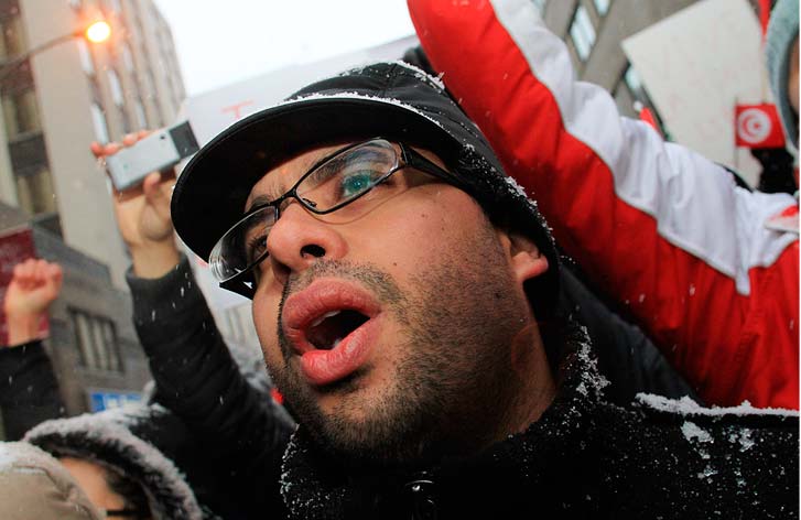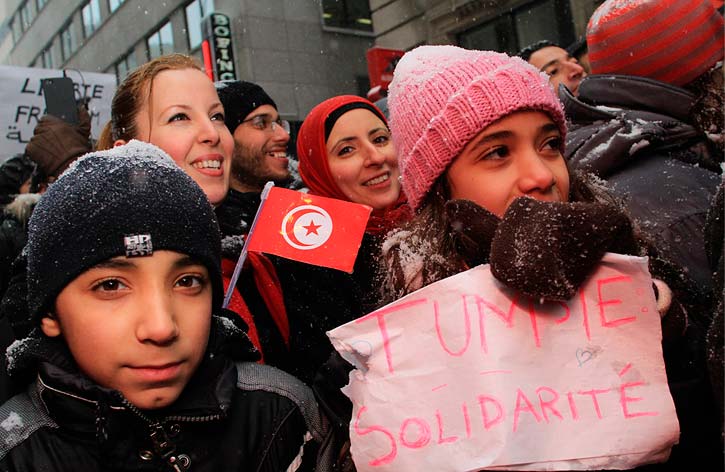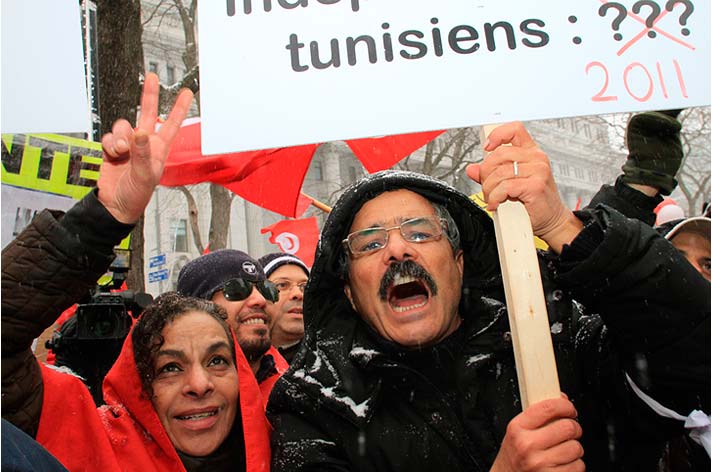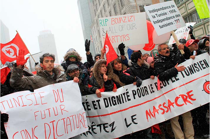 C’est derrière une banderole géante sur laquelle on pouvait lire «Arrêtez le massacre» qu’environ 2000 marcheurs se sont rassemblés pour exprimer leur soutien au peuple tunisien. Une foule électrisée par les derniers développements qui viennent de se dérouler dans leur pays d’origine. Le Président Ben Ali, en place depuis 23 ans, vient de quitter sa position sous la pression populaire. Depuis plusieurs jours, le peuple tunisien se soulève contre la corruption et la misère, et se bat pour que le carnage et la répression se terminent, et ainsi connaître enfin la liberté.