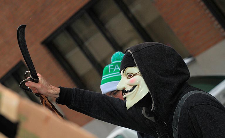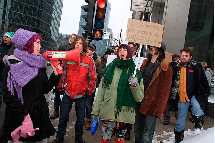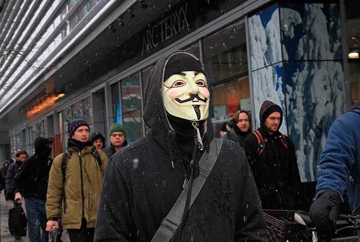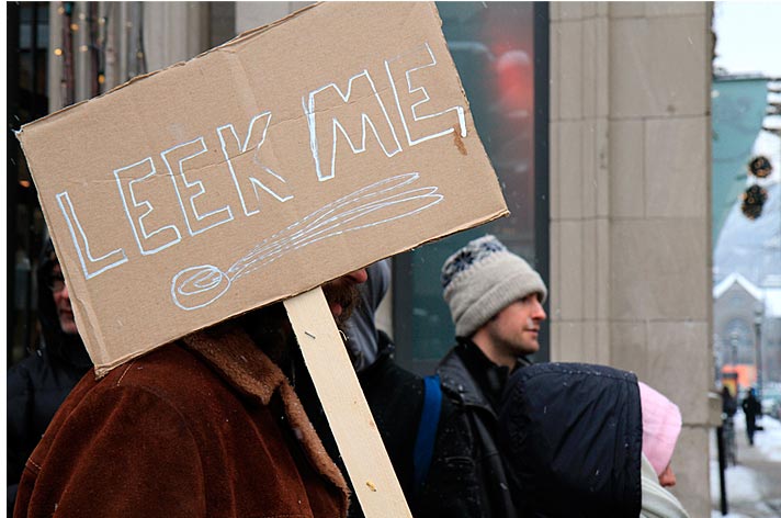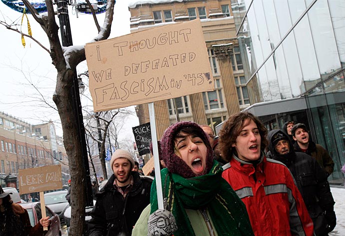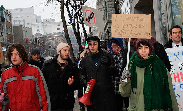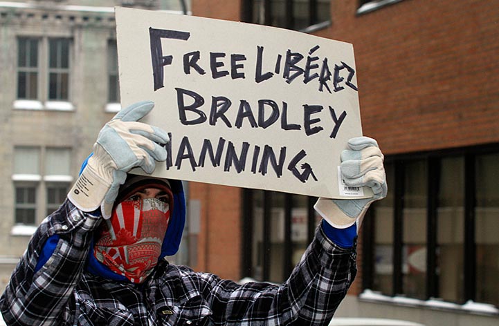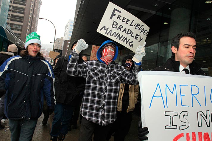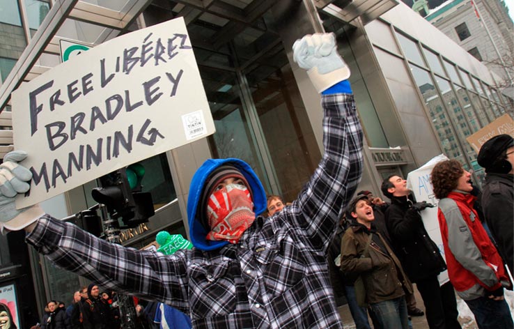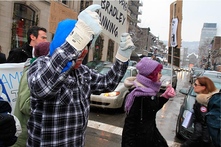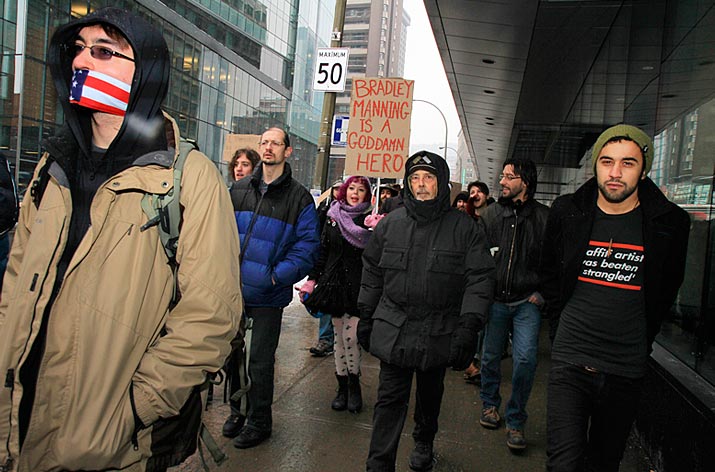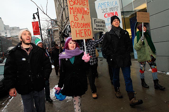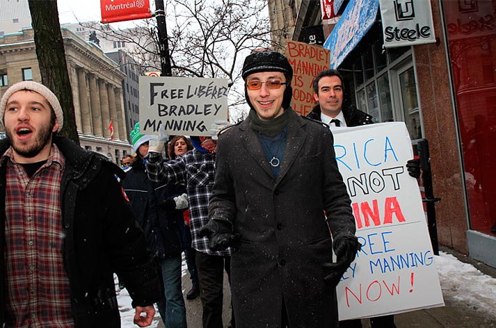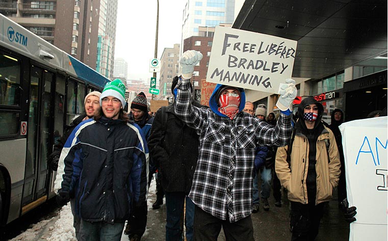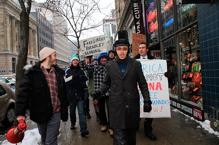 Des partisans de WikiLeaks ont déambulé sur la rue Sainte-Catherine jusqu’au consulat des États-Unis pour signifier aux diplomates américains que la censure n’est pas tolérée. Ils demandaient du même coup de libérer Bradley Manning soupçonné d’être l’auteur des fuites concernant les crimes de guerre commis par les forces américaines à l’étranger.