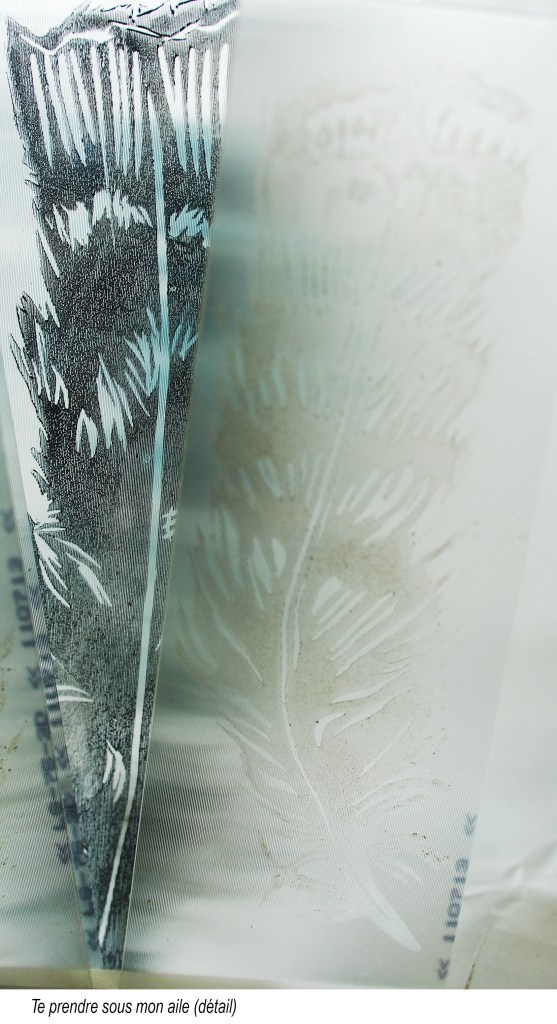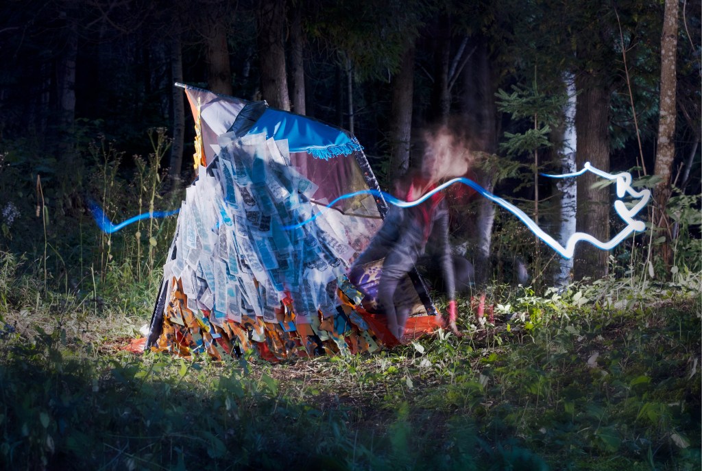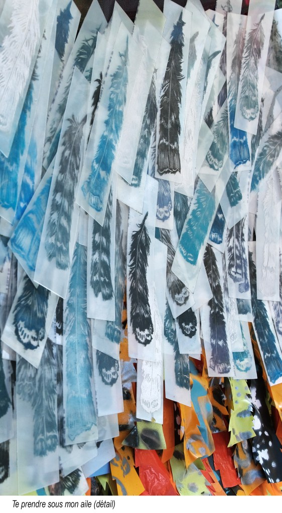 > images 14 à 18 (Te prendre sous mon aile) : aluminium, tissu imperméable, moustiquaire, couverture de survie, vinyle, peinture aérosol, agrafes et boutons pressions