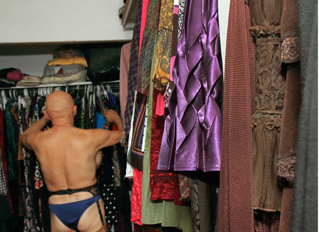 Dès l’instant où Jules m’a été présenté, je savais que je devais faire un projet photo montrant cet insaisissable personnage dans son univers, son quotidien. Mais quel était le véritable sujet? Certes, Jules projette une image déstabilisante pour qui le regarde : cet homme de plus de soixante-dix ans, au corps musclé et au parler viril, qui s’habille en femme et porte… des seins. Une véritable curiosité!
