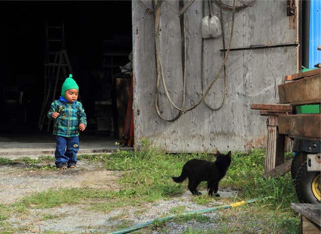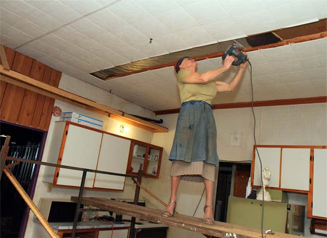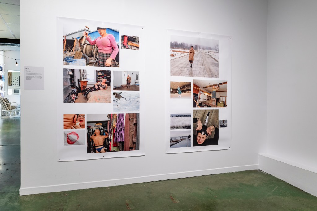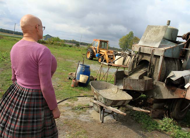 Citoyen d’un village de 594 habitants, la résidence de Jules se situe à l’intersection de la route 133 et du chemin du Moulin, à côté de la croix de chemin. Une rivière contourne de justesse le magasin général et l’église pour se perdre dans les nombreuses terres agricoles. L’air déborde de solitude. Je retrouve Jules à son travail. Vêtu d’une jupe de laine écossaise grise et noire à plis plats parfaitement pressés, rehaussée d’un chandail lilas à encolure ronde soulignant à merveille sa poitrine proéminente et ses abdominaux musclés, le tout accessoirisé de bas nylon trois quarts rouges rappelant la fine ligne de même teinte de sa jupe et d’une paire de sandales noires à semelles plateforme, il se met rapidement à l’ouvrage. Jules exploite une petite entreprise où il malaxe et coule le béton pour former des blocs de près de 45 kg.