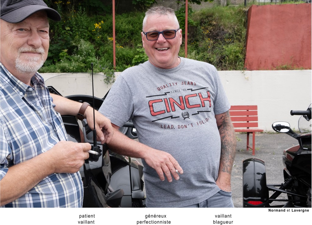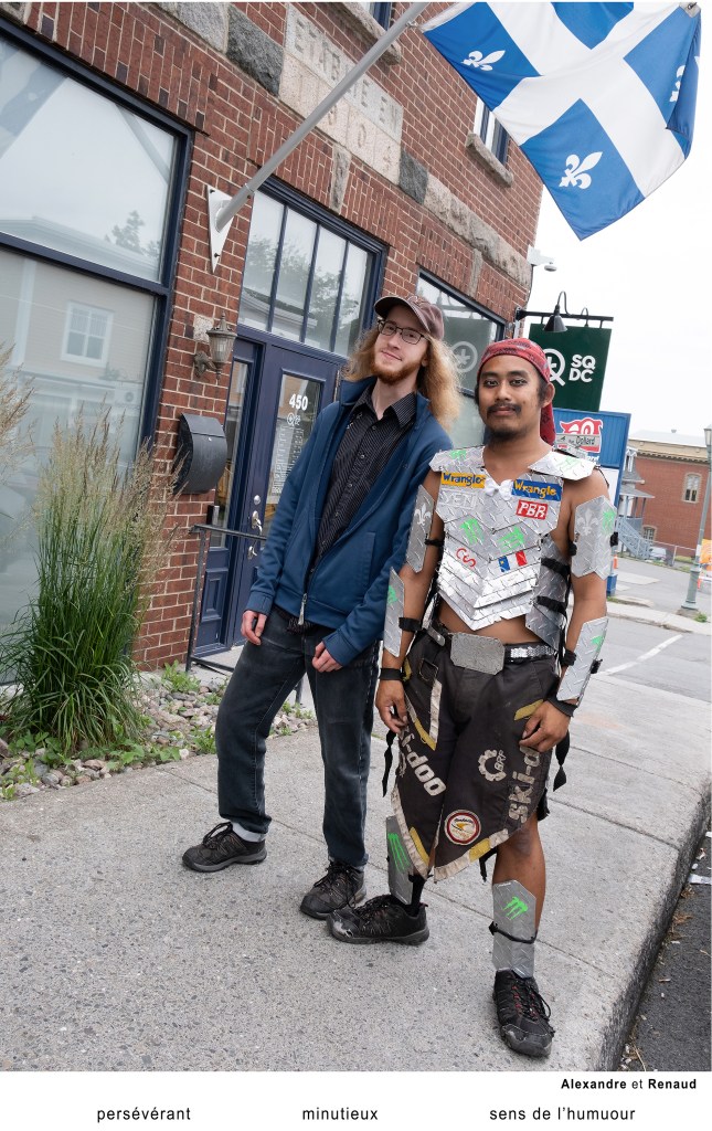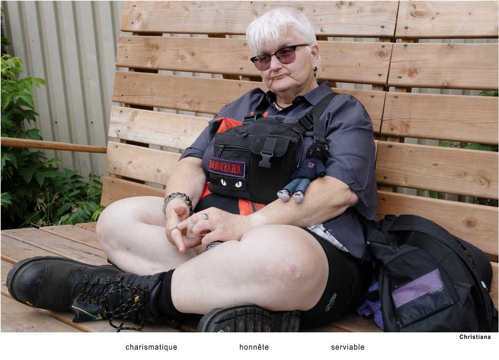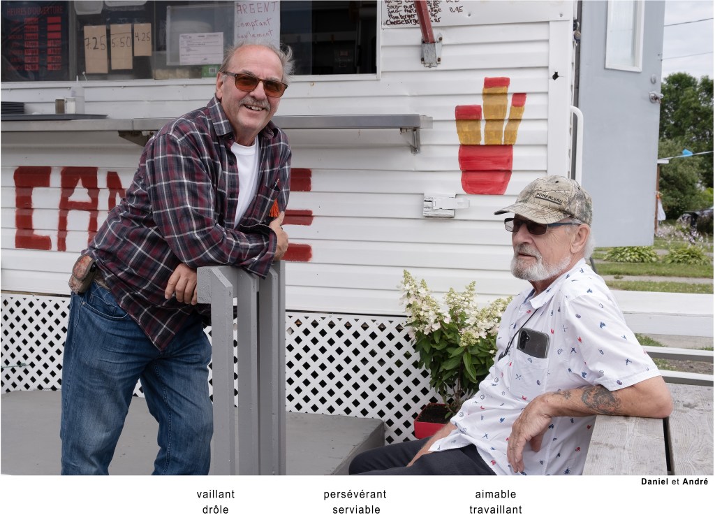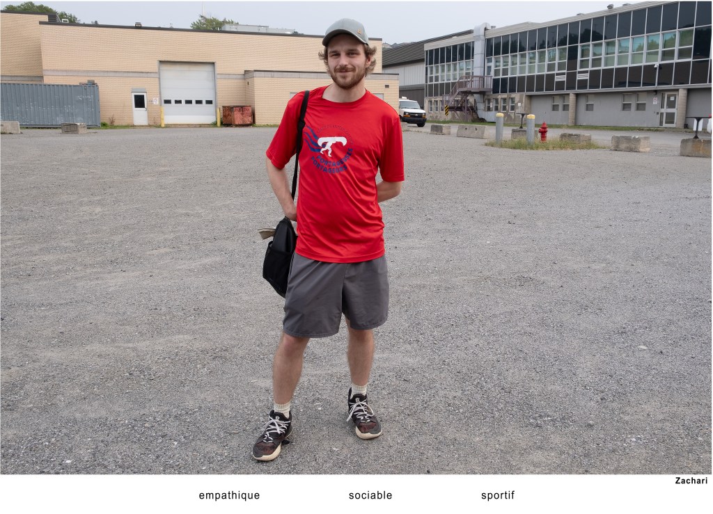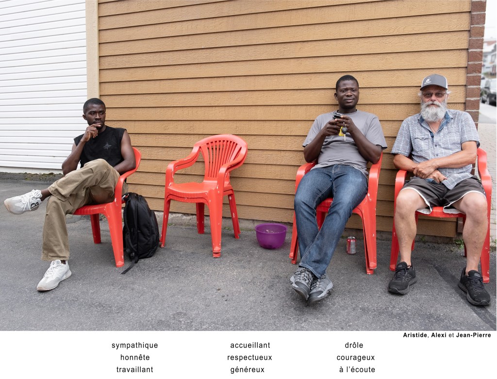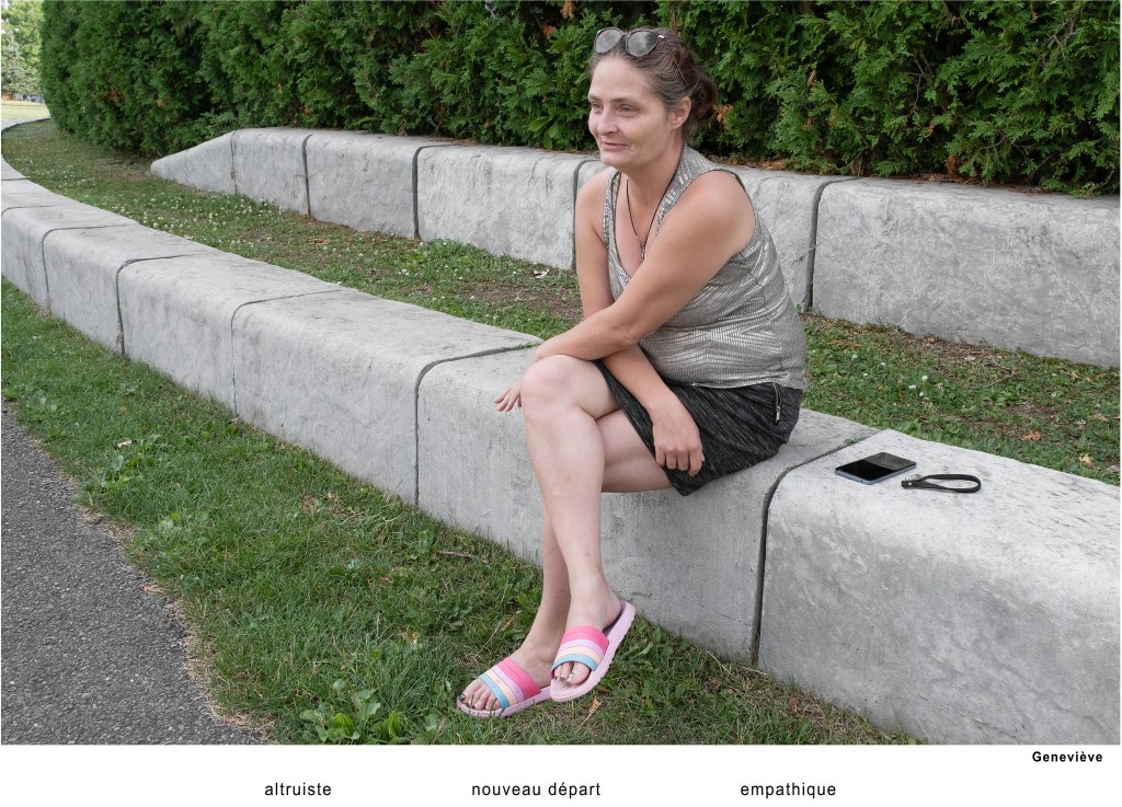 Les participants regardent rarement l’objectif. Ils sont occupés à chercher les trois caractéristiques qui les définissent. Sans mise en scène préalable, le sujet est photographié là où il se trouve : sur la rue, dans un stationnement, derrière un édifice. Des endroits sans grande valeur esthétique. Aucun récit décrivant la rencontre qui s’est déroulée ne vient charger l’image d’une émotion subjective. Moi en trois mots devient un portrait du quotidien, de l’ordinaire.