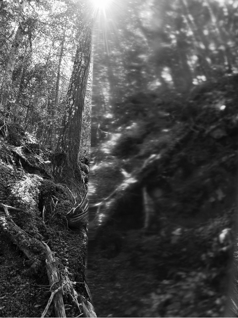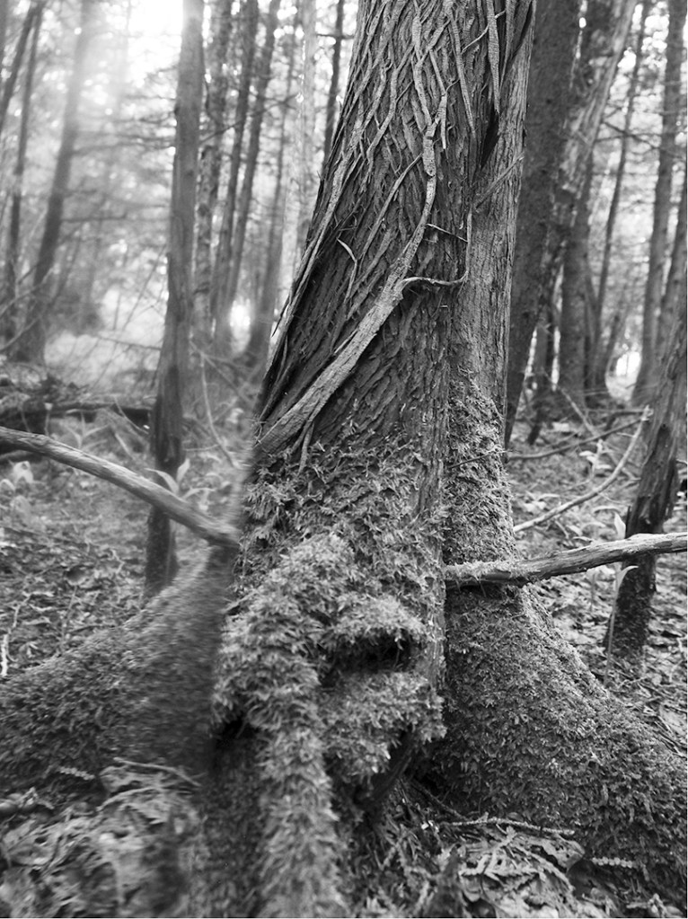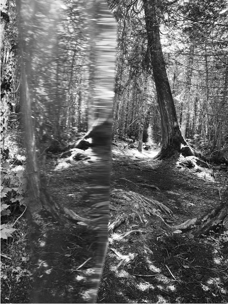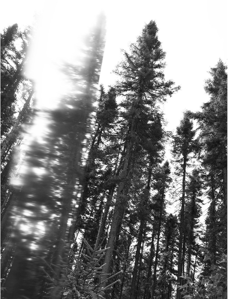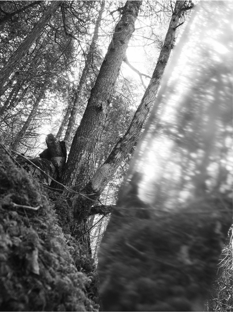 Série de photographies en noir et blanc, accompagnées d’extraits d’entrevues de gens pour qui la forêt joue un rôle important dans leur vie.