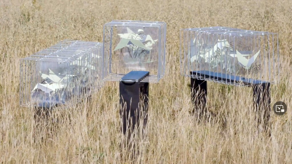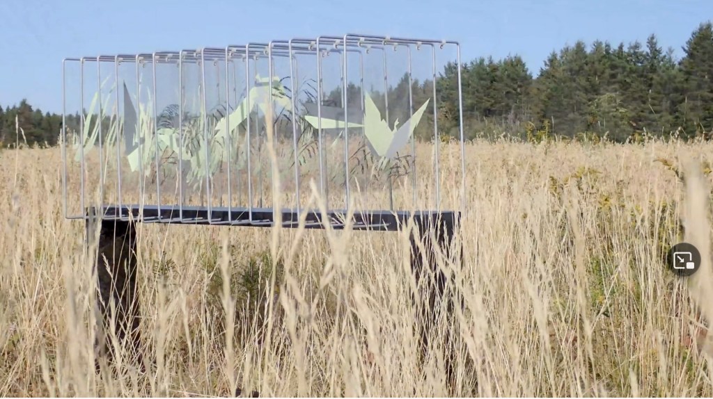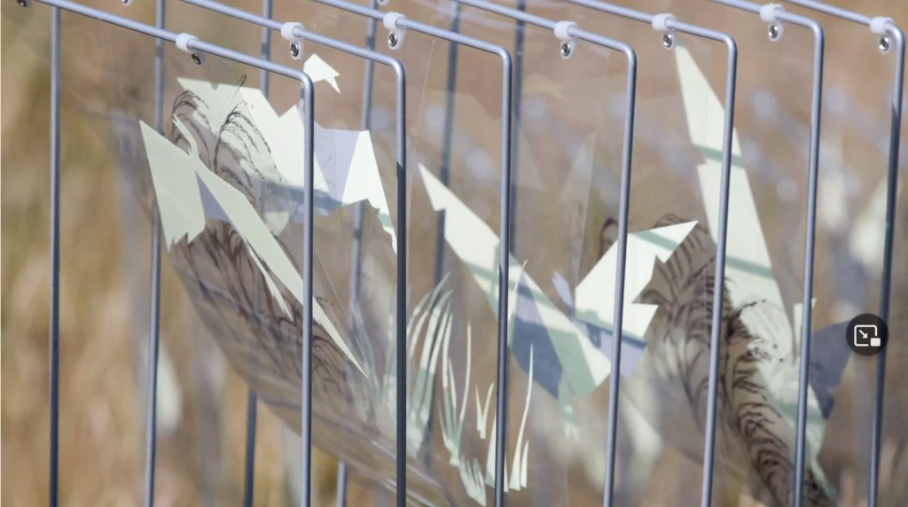 L’installation Tracé aléatoire vise à évoquer une action par un jeu de perception. Inspirée par un procédé proche du film d’animation, soit la superposition d’une séquence de dessins représentant les différentes phases d’un geste, une volonté de mise en mouvement est obtenue. Tantôt une oie en vol, tantôt des herbes ou des graminées, sont juxtaposées sur des acétates de même dimension. La partie supérieure de celles-ci est fixée à des cadres métalliques individuels retenus à une base en bois. Les pellicules transparentes, lorsqu’elles s’agitent au gré du vent, prennent alors la forme d’une envolée d’oies blanches. Installée dans un endroit sombre, une vidéo montrant des images panoramiques qui s’enchaînent rapidement, est projetée sur les trois modules de l’œuvre et accentue la sensation de déplacement. Tracé aléatoire propose différentes interprétations : autant le visuel représenté sur les acétates qui ondulent donne une impression de liberté; autant la série de cadres métalliques évoque une sorte de cloison qui compartimente les oiseaux, comme s’ils étaient en captivité.