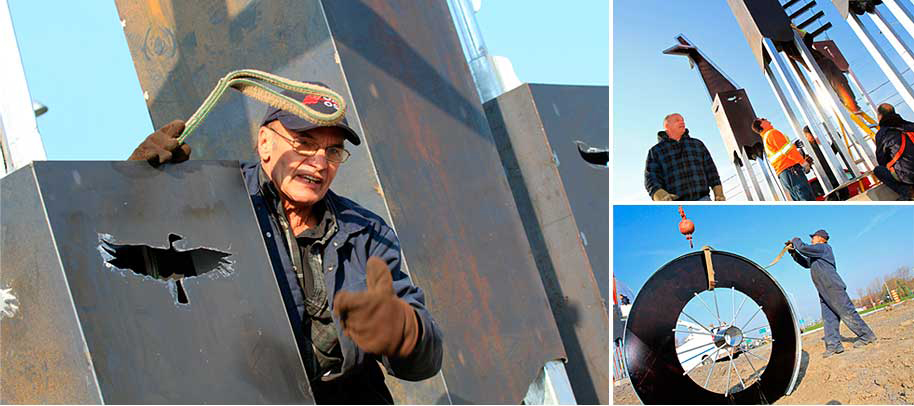 Inspirée par le thème: le transport d’hier à aujourd’hui, la sculpture intitulée La rose des vents se compose de cinq piliers d’acier chapeautés de symboles tels une montgolfière, un voilier, un avion, une roue et une voie ferrée. Ces photos documentent sa réalisation.