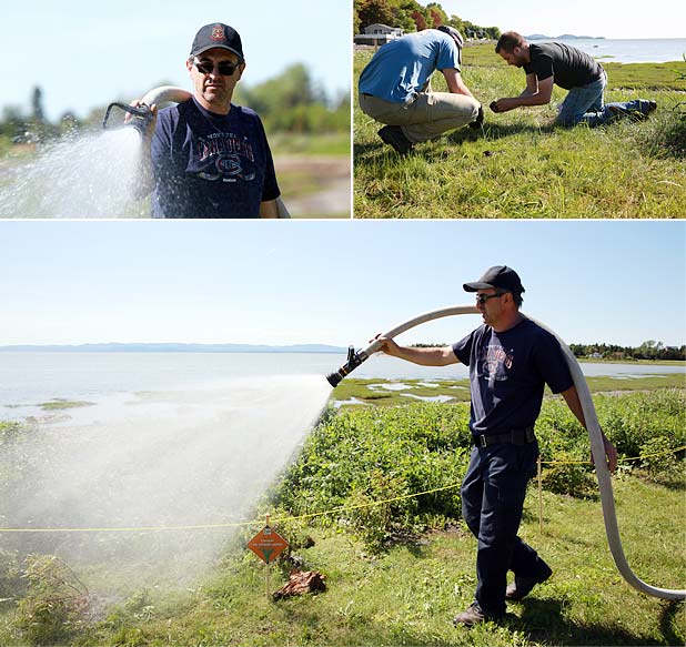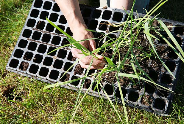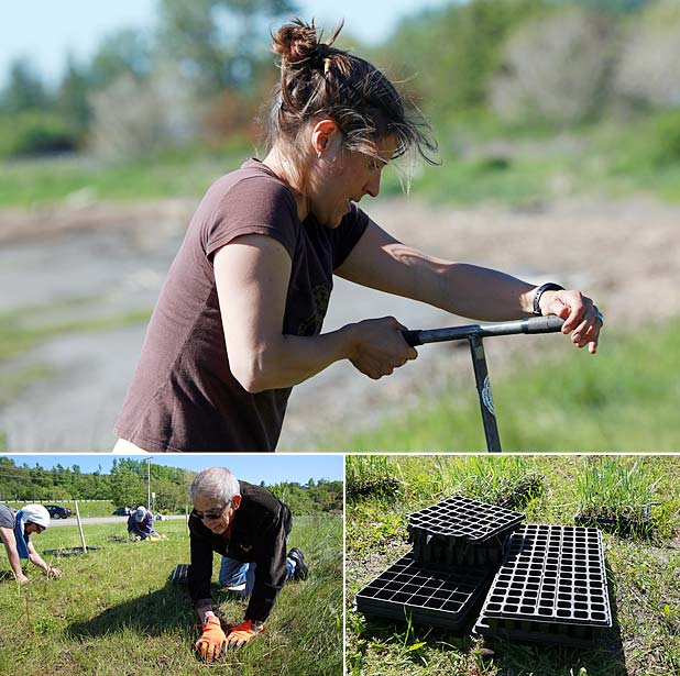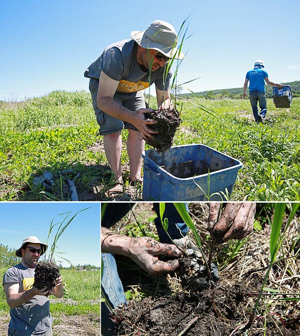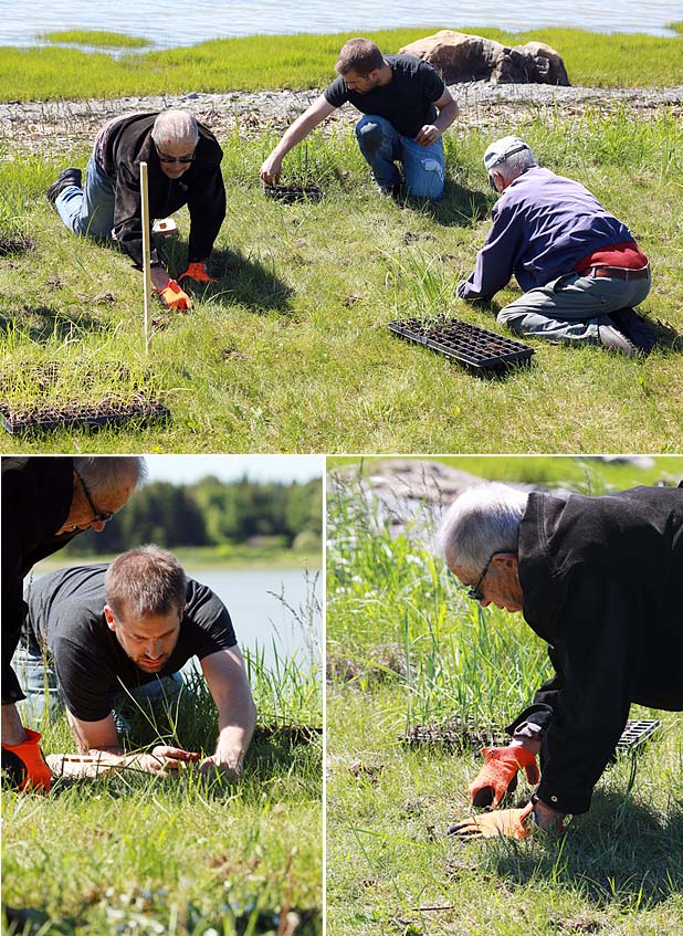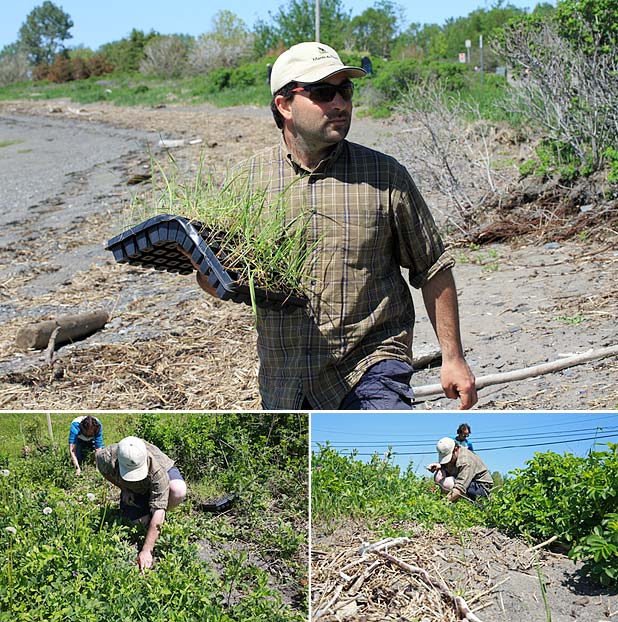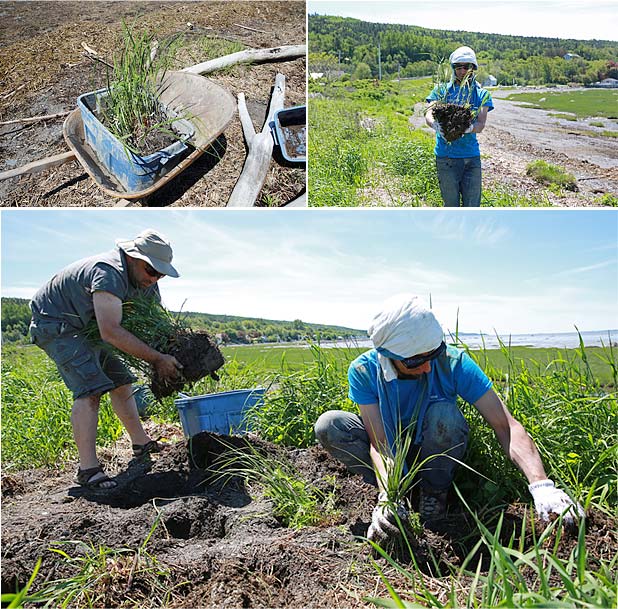 Possédant un système racinaire très développé et un feuillage souple qui joue le rôle d’un filet, l’Élyme des sables d’Amérique (Leymus mollis mollis) et la Spartine pectinée (Spartina pectinata) retiendront le sédiment en place et devraient contribuer à stabiliser le sol.15h30, il reste encore quelques cassettes à vider de leur contenu. Toute l’équipe redouble de courage et entame un sprint final!