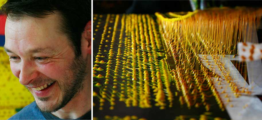 Muni de gants de caoutchouc et d’un pot de peinture industrielle jaune serein, l’artiste saute d’une surface à l’autre, sans s’arrêter. L’atelier est bientôt baigné dans un univers de points.