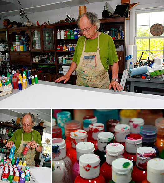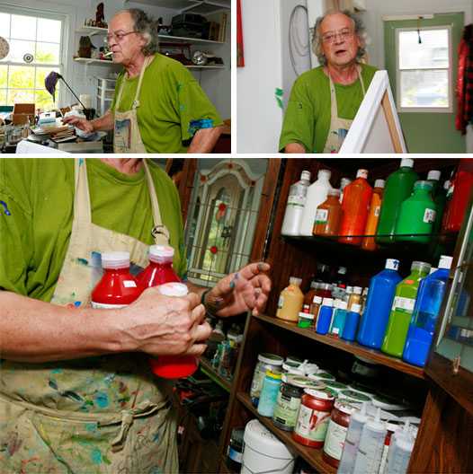 Sélectionnant à nouveau minutieusement ses couleurs, il reprend son travail d’un geste rapide et libre de toutes contraintes. Toujours alerte, je continue de capter les interrogations de l’artiste à travers ses explorations.