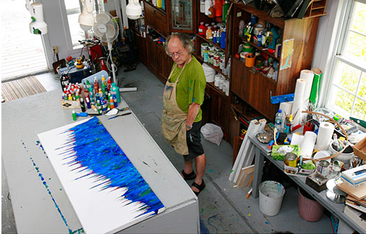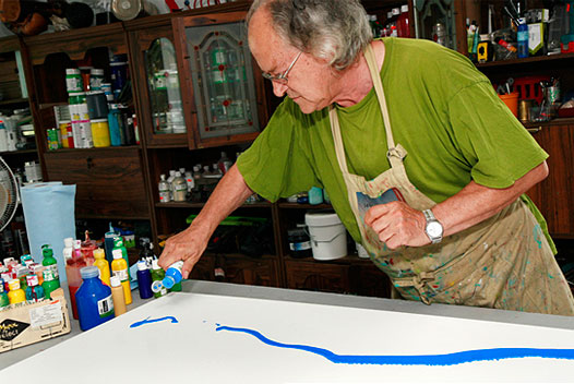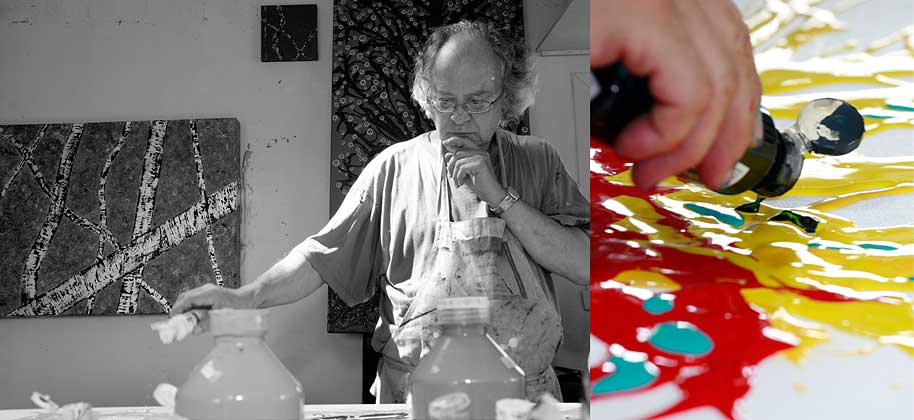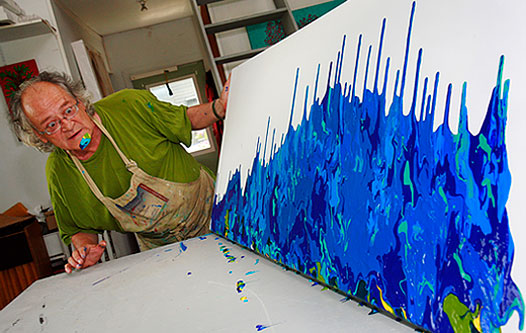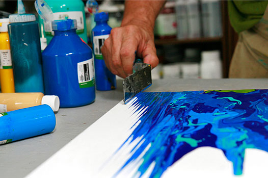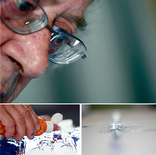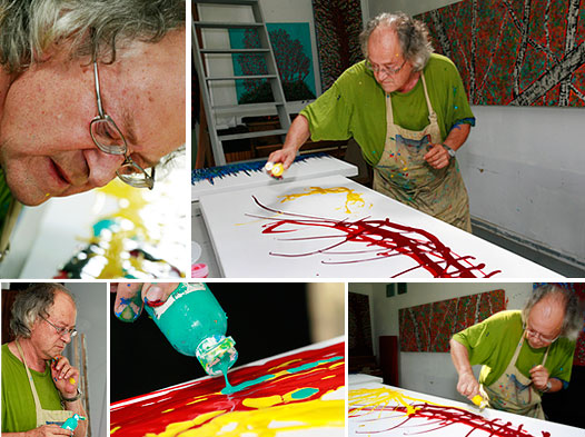 Puis soudainement, l’artiste soulève le canevas, le remue énergiquement d’abord vers la droite, puis vers la gauche, toujours en surveillant attentivement les coulées qui se précisent.