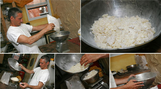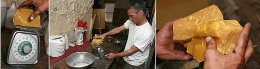 L’artiste se met rapidement à l’oeuvre. Il prend d’abord un bloc de cire d’abeille et le dépose sur une balance. 21 grammes. Il empoigne ensuite un sac de résine de Damar et en verse une bonne quantité dans un bol et pèse à nouveau l’ensemble minutieusement. Il retire quelques cristaux du contenant. Voilà, le compte y est! Ne reste plus qu’à faire fondre le tout.