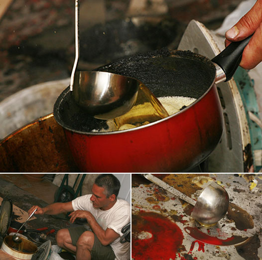 Il n’y a ni pinceau ébouriffé par l’usure, ni tube de peinture biscornu dans l’atelier de Lemay. On y retrouve plutôt des casseroles de différents formats, une cuisinière, une friteuse, des conserves vides, quelques grattoirs, une louche et des spatules de maçon. Tout l’arsenal pour travailler l’encaustique.