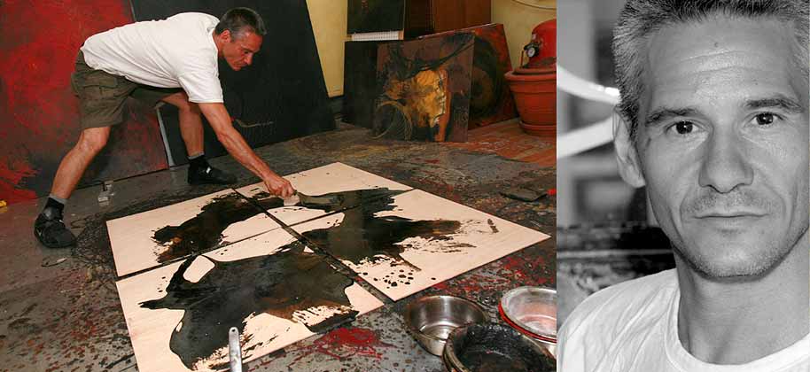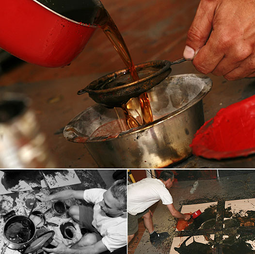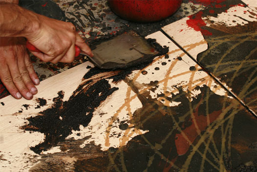 Stephan profite de ce moment pour déposer sur le sol quatre panneaux de bois de 2 pieds par 2 pieds et du même coup, se laisse aller à un instant de visualisation. Une fois liquéfiée, l’artiste incorpore des pigments dans la cire, remue attentivement et filtre le liquide. Empoignant fermement le chaudron bouillant, Stephan commence à en verser le contenu sur les surfaces de bois. De belles taches anthracite au fini satiné se dessinent. Porté par le résultat, l’alchimiste continue son rituel. Il mêle des pigments rouges à sa potion qu’il veut plus translucide cette fois. Les vapeurs se dégagent du bouillon dont la riche teinte ambrée me fascine aussitôt. Tournant autour de son tableau, l’artiste laisse échapper quelques flaques de liquide qui courent se blottir contre les traînées précédentes. Stephan s’empare par la suite d’une spatule qu’il enduit d’une matière granuleuse, d’un brun chaud et profond. Du café! Il étend, gratte et superpose la couleur puis se recule.
