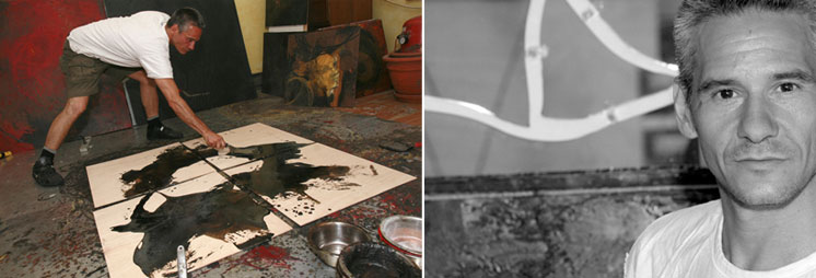 EN OUVRANT LA PORTE de l’atelier, une plaque d’aluminium étendue sur le sol et recouverte d’épaisses spirales anthracite, bistres et sang de boeuf me saute aux yeux. Ces mêmes textures, traînées et taches collées sur le métal apparaissent dans les oeuvres de Stephan Lemay, dont plusieurs sont adossées au mur du fond. Une énergie brute se dégage de la pièce.